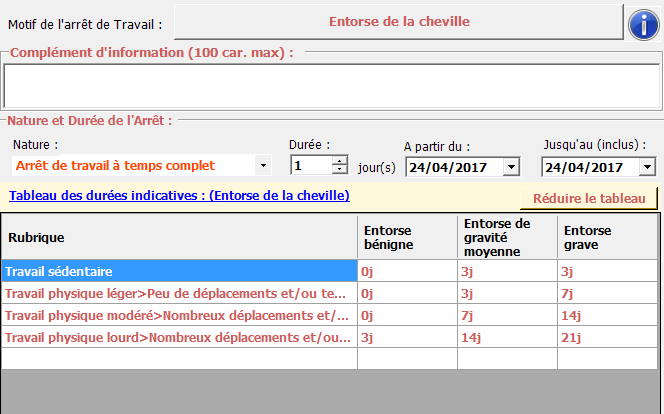 Un double clic sur une durée, permet de réduire le tableau et de sélectionner cette durée, l’interface détermine alors la date de fin de l’arrêt