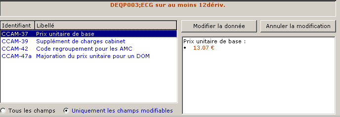 La partie inférieure de l’écran présente les données du référentiel CCAM pour l’acte sélectionné. Ces données sont affichées quelque soit le mode de recherche (arborescence, mots clés, favoris).