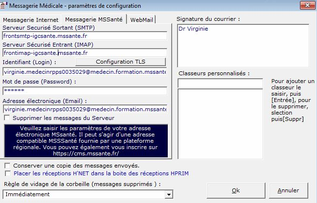 Saisir les données demandées et cliquer sur [Ok] pour valider cette saisie. Utiliser les items figurant sur l'image ci-dessus pour le Serveur sortant (SMTP) et le serveur entrant (IMAP).